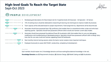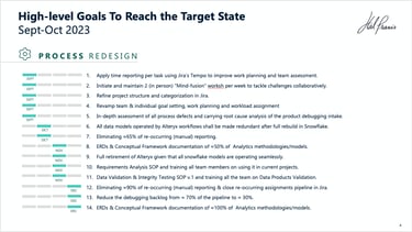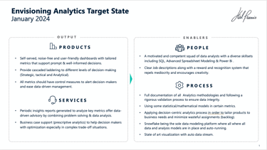 To transition the analytics function from report production to decision support, delivering scalable, trusted, and business-aligned analytics products.
