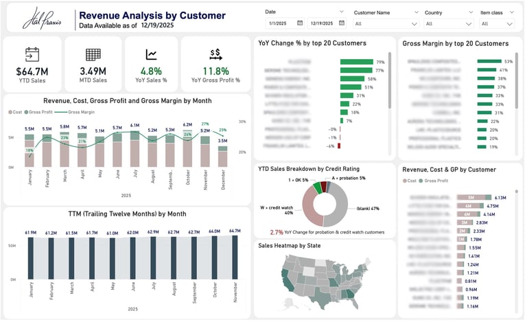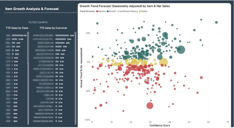 Financial reporting focused primarily on aggregated revenue trends, while margin analysis was fragmented across spreadsheets and ad-hoc analyses. As the business expanded into new items and customers, leadership needed a single, coherent performance framework to understand growth quality, risk concentration, and future demand patterns.